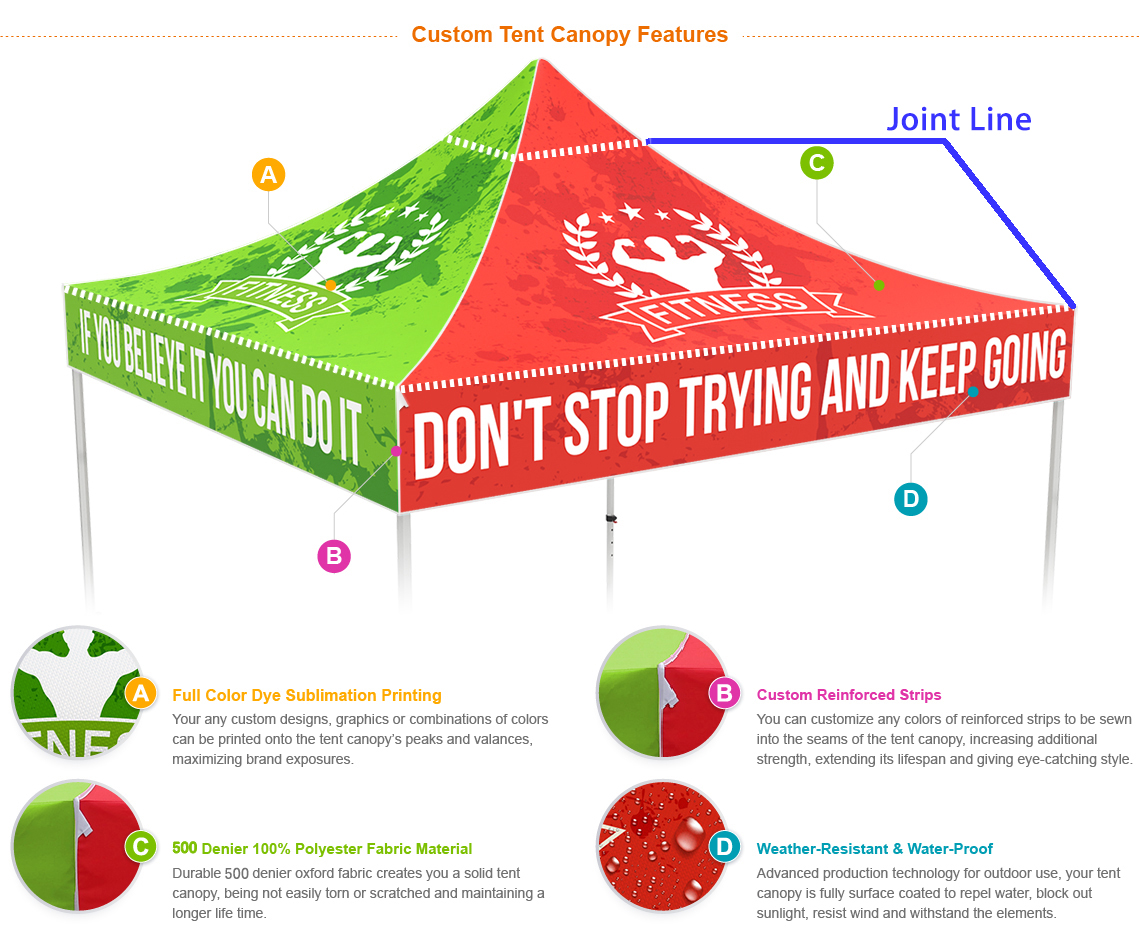 The tent top is printed on 500D Oxford fabric. Our dye sublimation printed tent top can ensure you clear and crisp color. If you want to be unique among the trade show booth, you definitely need a custom advertising tent. And the flame retardant, water proof and UV protection 500D oxford fabric makes it weather resistant and durable.